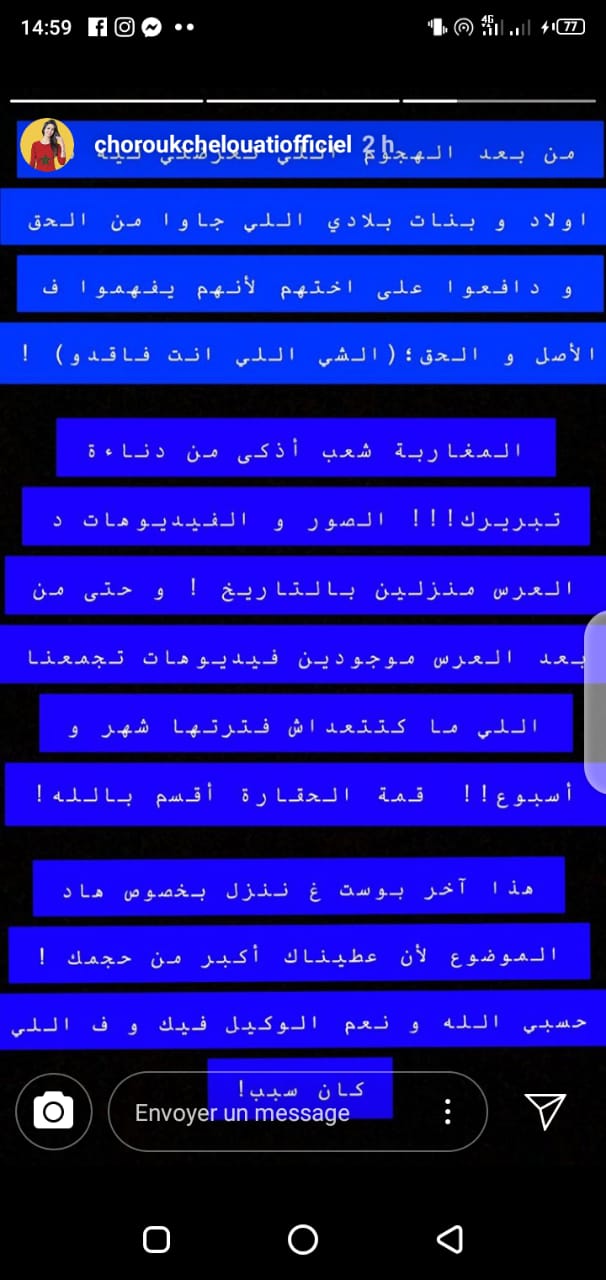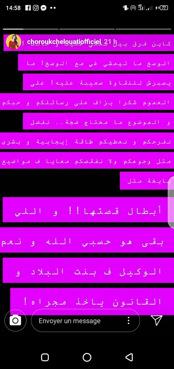 Chorouk a, en effet, tout déballé à travers des stories Instagram qui ont enflammé la toile ! La jeune marocaine a annoncé être victime de trahison de la part de son ex partenaire Irakien, qui a, de son côté, démenti ces accusations. Il a fallu quelques heures afin que cette histoire fasse la Une sur Facebook ou encore Instagram…