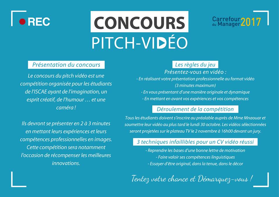 Cette année, les étudiants de l’ISCAE pourront participer lors du Carrefour du Manager au concours du meilleur CV vidéo qui a pour objectif de présenter le candidat de façon originale et dynamique. Les étudiants devront se présenter en 2 à 3 minutes en mettant leurs expériences et leurs compétences professionnelles en images.
