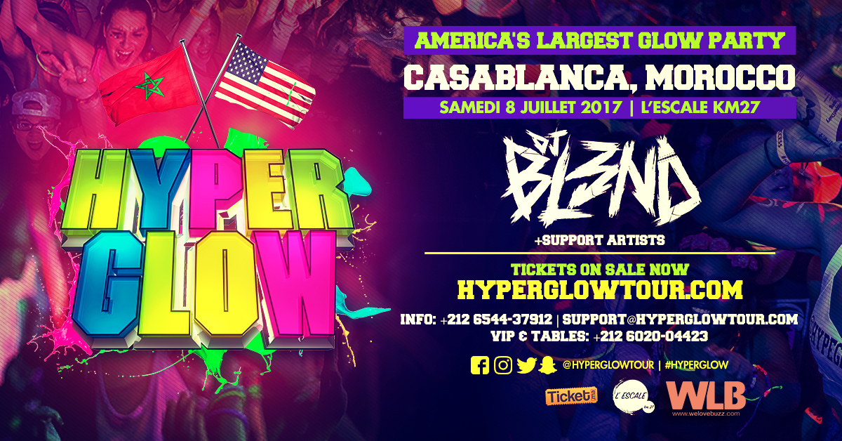 Nous vous avons dit qu’un nouveau festival de musique s’installerait au Maroc cet été, mais on n’en savait pas plus ! Festival américain de folie, il connaît un franc succès auprès des jeunes de part la diversité du programme : robots, body painting et lumières UV. De quoi en perdre la tête ! En tête d’affiche, des DJ de renoms comme Steve Aoki, W&W, Borgeous, Quintino… Waouuuuuuh. Vous l’avez deviné, il s’agit du HYPERGLOW !