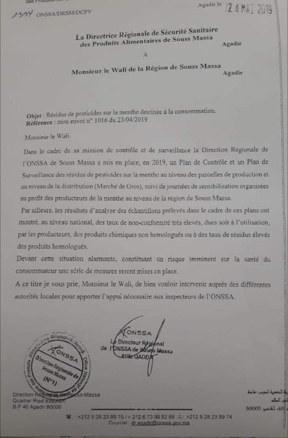 « Dans le cadre de sa mission de contrôle et de surveillance, la Direction régionale de l’ONSSA a mis en place, en 2019, un plan de contrôle et un plan de surveillance des résidus de pesticides sur la menthe au niveau des parcelles de production et au niveau de la distribution (Marché de Gros), suivi de journées, de sensibilisation organisées au profit des producteurs de la menthe au niveau de la région de Souss Massa. » peut-on lire dans le courrier envoyé.