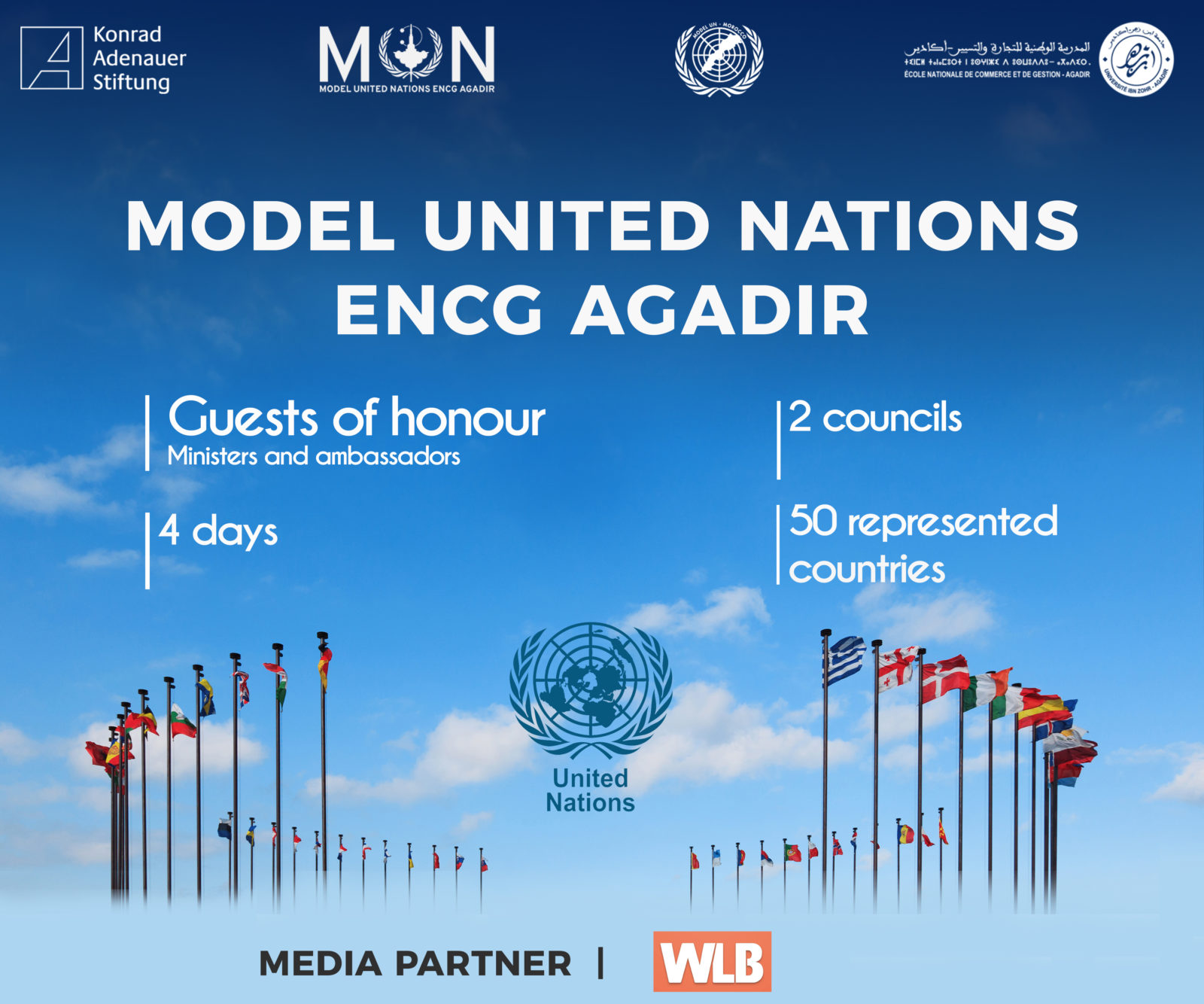 Organisé pour la première fois au sein de l’université Ibn Zohr, et plus précisément à l’ENCG d’Agadir, le modèle des Nations Unies (MUN) est une simulation des Nations Unies, s’étalant sur quatre jours à travers laquelle les jeunes prennent le rôle de représentants des nations et apprennent à analyser des sujets d’actualité et des discours publics qui prennent partie des objectifs du Millénaire, fixés par les Nations Unies et ce, suivant le protocole Onusien et en présence d’une quinzaine d’invités de haut calibre (ministres, ambassadeurs et intellectuels, etc.).