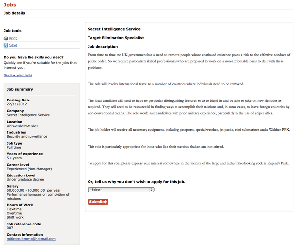 Samedi dernier, le gouvernement britannique a mis sur son site internet dédié à l’emploi, une annonce pour intégrer le rang des agents 007. Deux jours après, la page en question n’est plus disponible, et fort heureusement, le webzine « The Verge » a réalisé une capture d’écran de cette légendaire (fake) annonce :