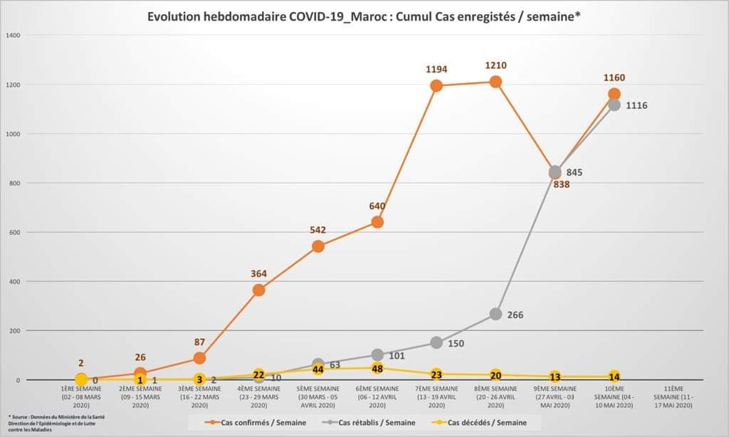 « Malheureusement, comme il est clair dans cette courbe graphique, nous ne somme toujours pas à l’abri. Nous pensions la semaine précédente que la situation épidémiologique du pays est en amélioration et sous contrôle et que nous nous éloignions progressivement du danger. Tous les marocains doivent cependant se rendre compte que la bataille n’est pas encore terminée. »a-t-il annoncé avant d’ajouter: « Nous avons avons accompli plusieurs choses et évité d’autres, grâce à notre solidarité et entraide, continuons alors d’être résistant face au Virus, et à tous les marocains: agissons tous ensemble avec responsabilité et plus de respect aux mesures préventives et état d’urgence actuel, sans quoi, nous devons tous assumer la responsabilité. »