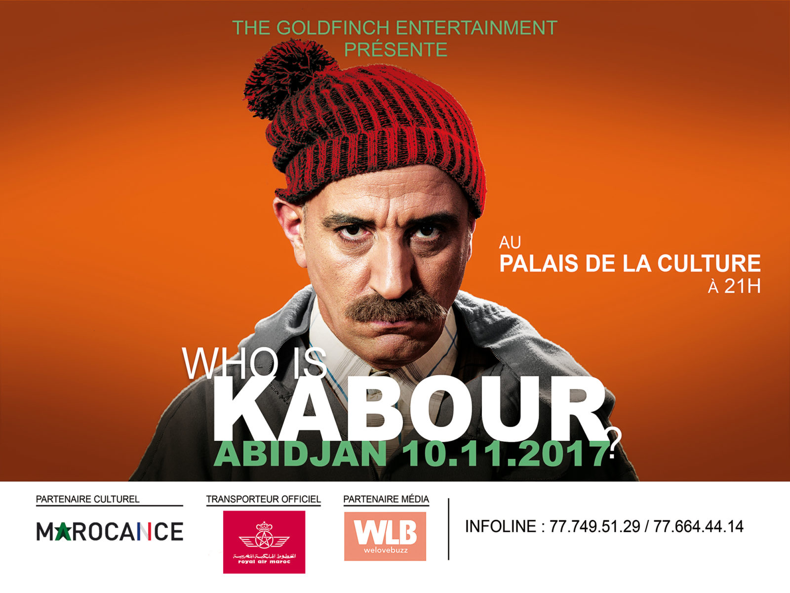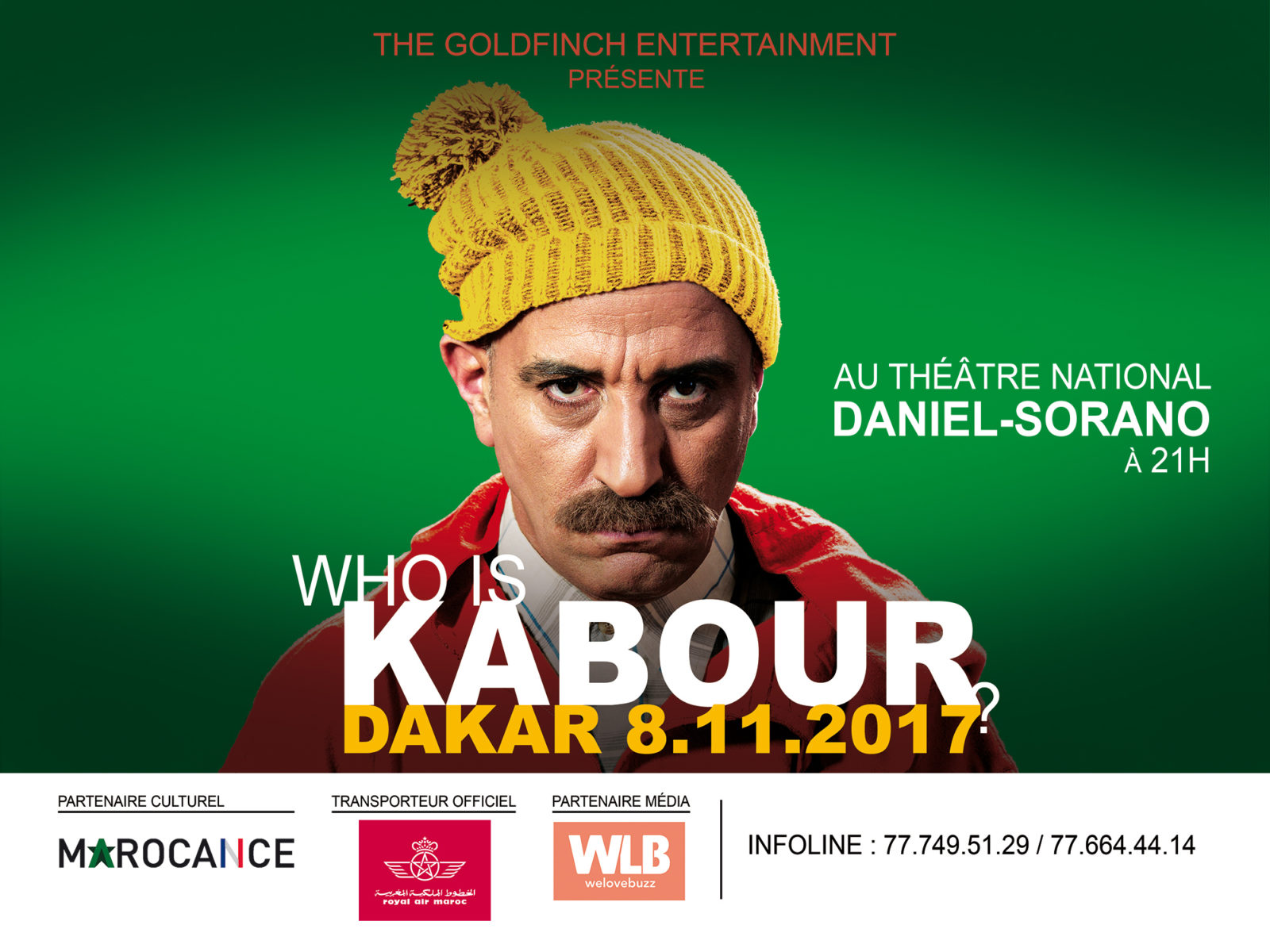 Après son grand succès sur la télé nationale, le fameux personnage de Kabour se donne une nouvelle vie sur scène, le temps d’une tournée entre l’Afrique de l’Ouest, le Maroc, l’Europe, le Canada et les Etats-Unis. Show totalement décalé, « Who is Kabour » sera présenté sous forme d’interview sur scène avec ce personnage incorrigible qu’est Kabour ! Grand délire et fous rires seront au rendez-vous !
